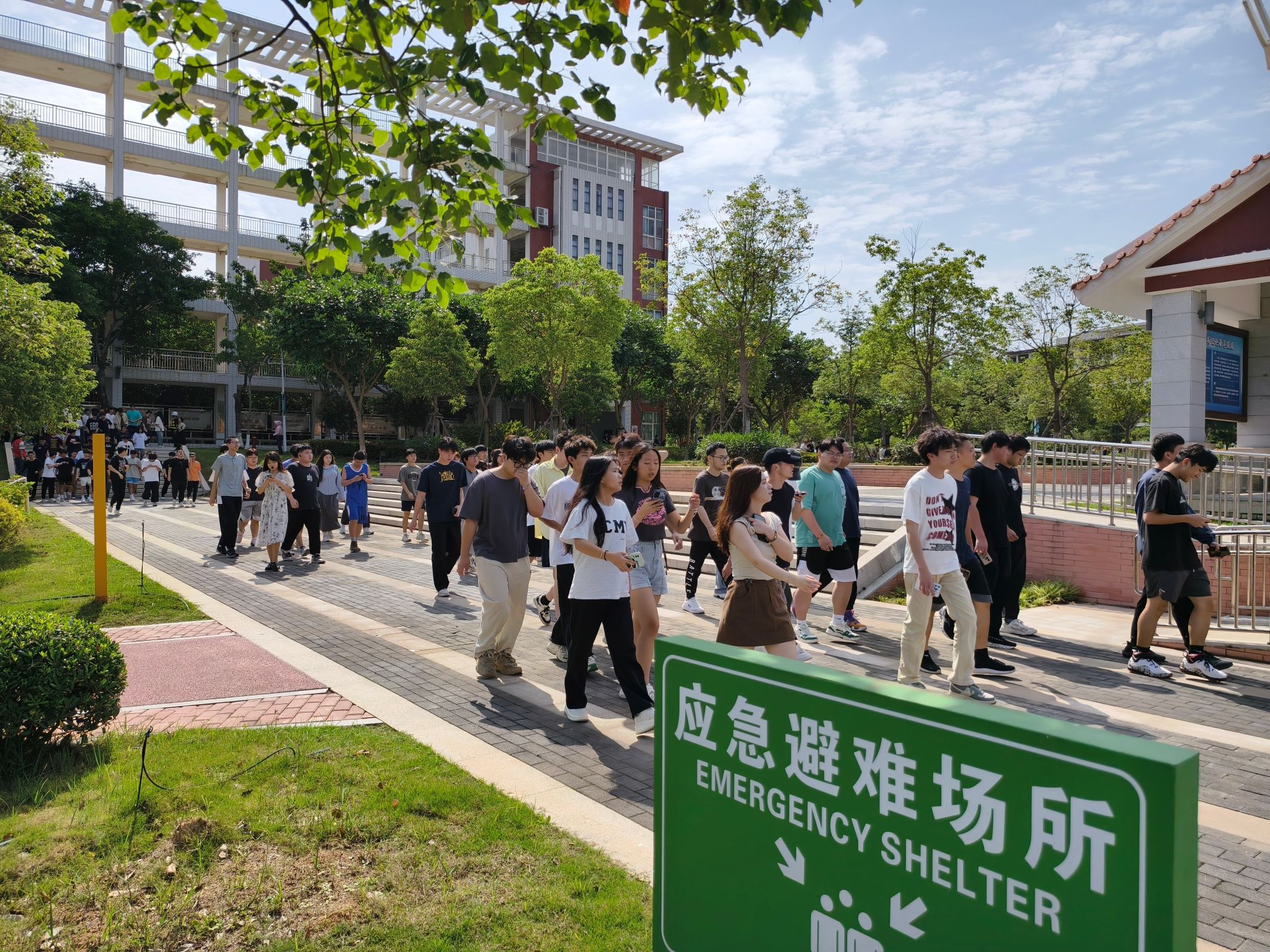 下午3点整,警报声响起,演练开始。教学区全体师生在工作人员的指导下护住头部,弯腰朝室外撤离,大家认真配合,撤离过程井然有序。