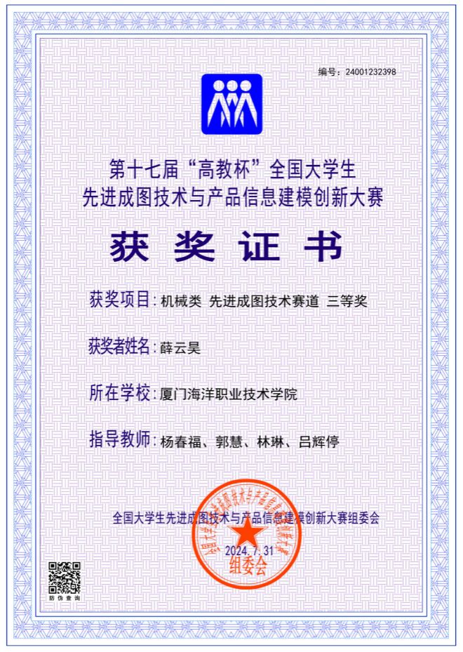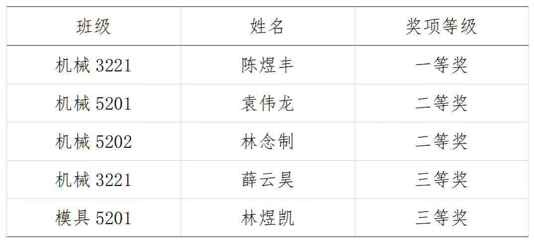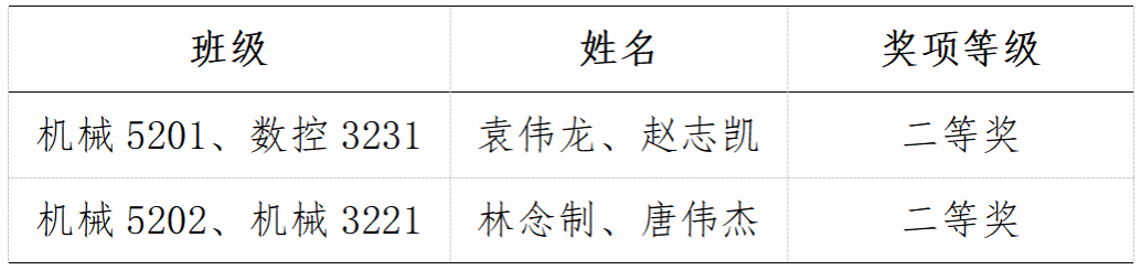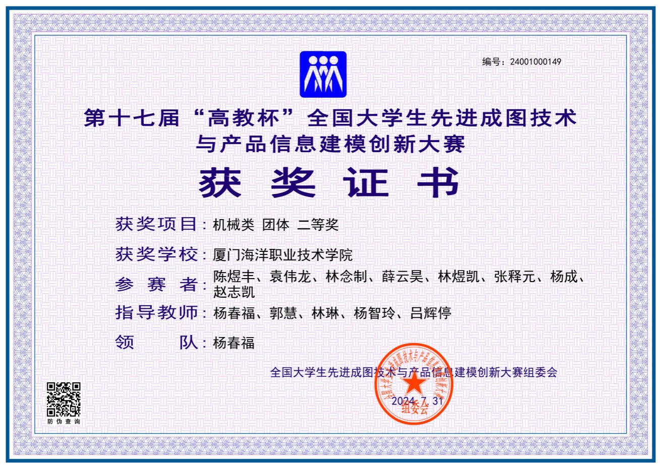 海洋机电学院11位同学参加了机械类4个赛道的比赛,最终荣获先进成图技术赛道一等奖1名、二等奖2名、三等奖2名,数字化创新设计赛道二等奖1组、三等奖1组,团体荣获二等奖。