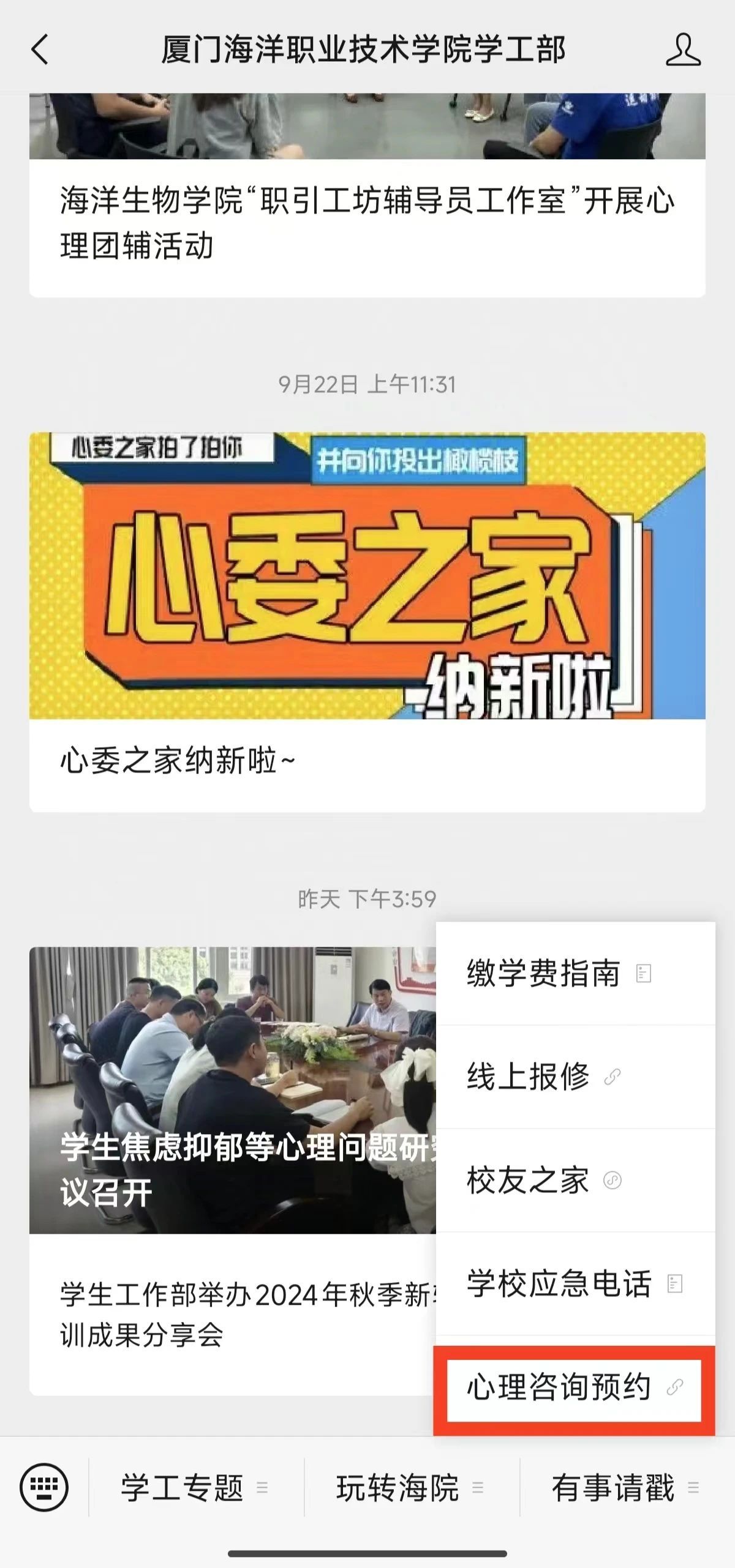 心理咨询的服务对象是全体在校生。心理咨询预约方式全体在校生(关注“厦门海洋职业技术学院学工部”微信公众号,点击下方菜单栏“有事请戳”进入心理咨询预约登录界面。登录账号是学号,初始密码是八位数生日,例如20000101)