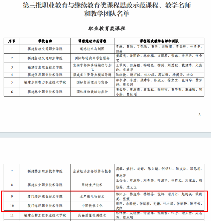近日,福建省教育厅公布了《福建省教育厅关于公布第三批课程思政示范项目(职业教育与继续教育类)的通知》,海洋生物学院郭团玉老师领衔申报的《水产微生物技术》和公共教育学院唐萍老师领衔申报的《中国传统文化》两门课程及团队成员获批福建省职业教育课程思政示范课程、课程思政教学名师和教学团队。