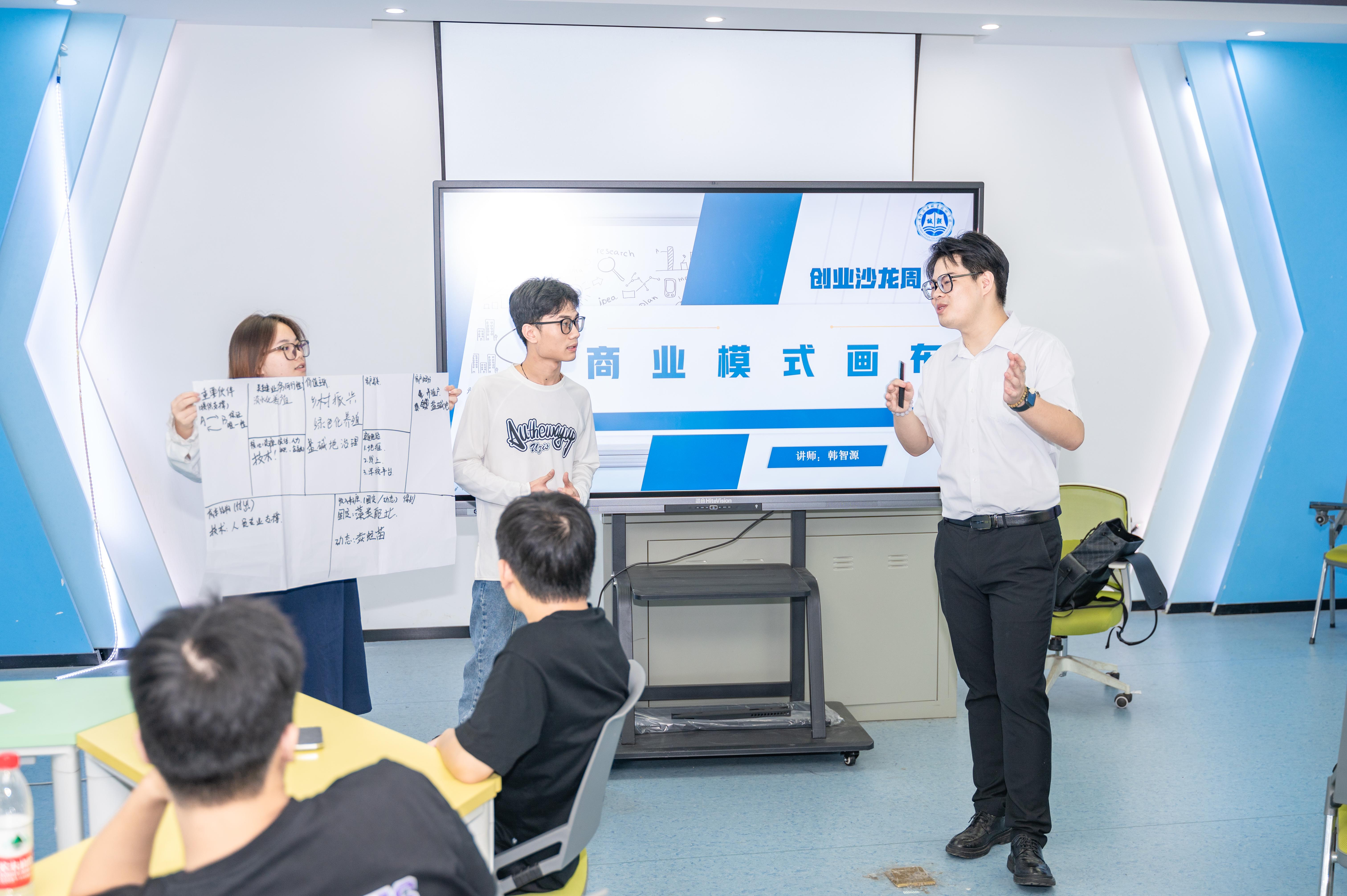 在创业沙龙上,厦门市海帆世纪人才服务有限公司项目合伙人韩智源为我校学生创业团队开展了以“商业模式画布”为主题的创业沙龙活动,活动中韩老师与创业团队就项目合作、市场运营等相关问题展开了深刻的交流探讨,指导学生团队进行商业模式实战演练,使大家能够以创业的角度更好地直面市场痛点并进一步优化技术创新方案。