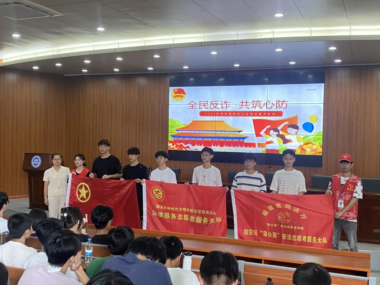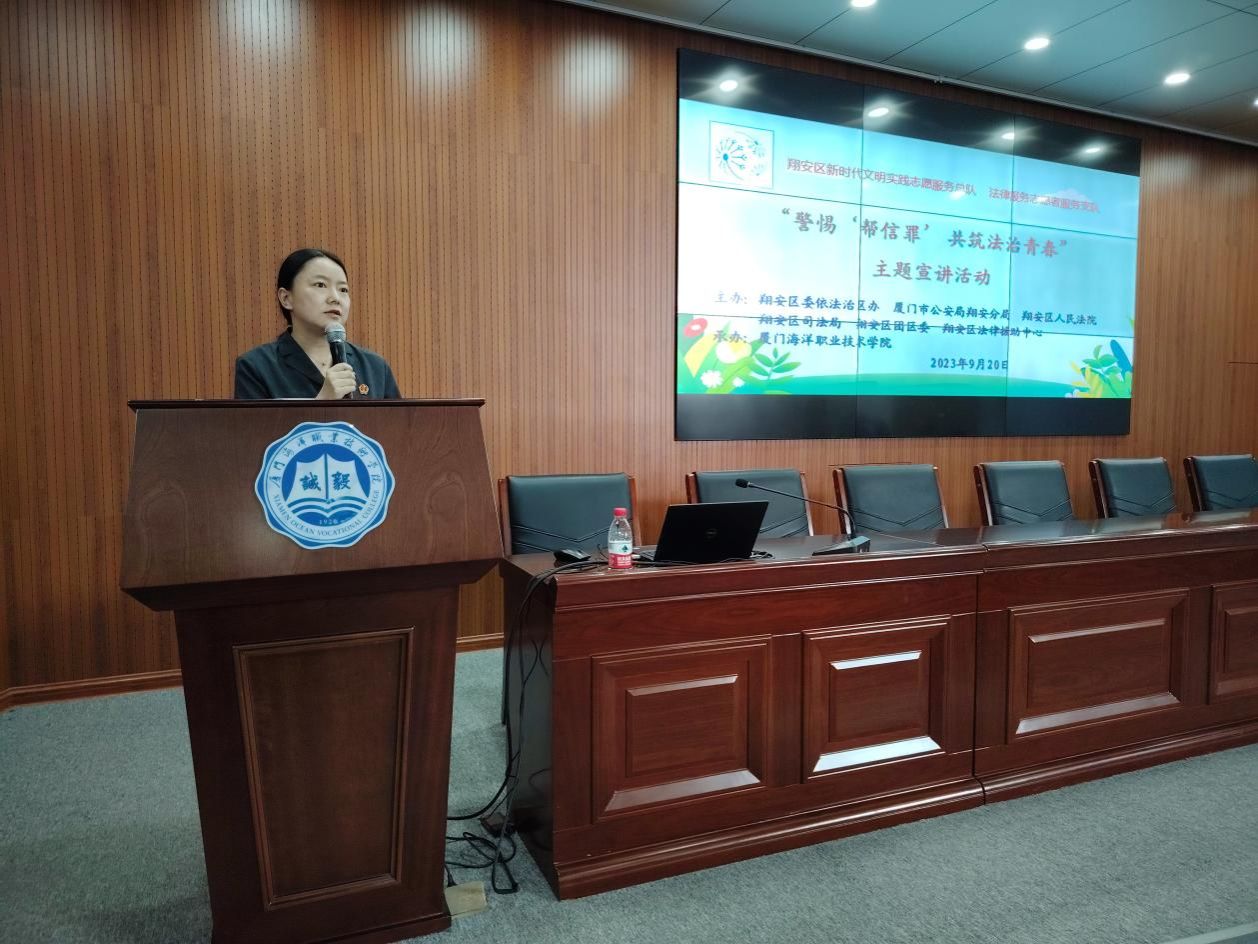 为进一步强化青年学生法治观念和自我保护意识,预防和减少违法犯罪行为,构建良好校园法治环境。9月20日下午,翔安区人民法院刑事审判庭庭长邓芳携手翔安区新店派出所社区民警蒋振熠走进厦门海洋职业技术学院开展“警惕‘帮信罪’ 共筑法治青春”主题宣讲活动,为学生们献上了一场干货满满的法治讲座。