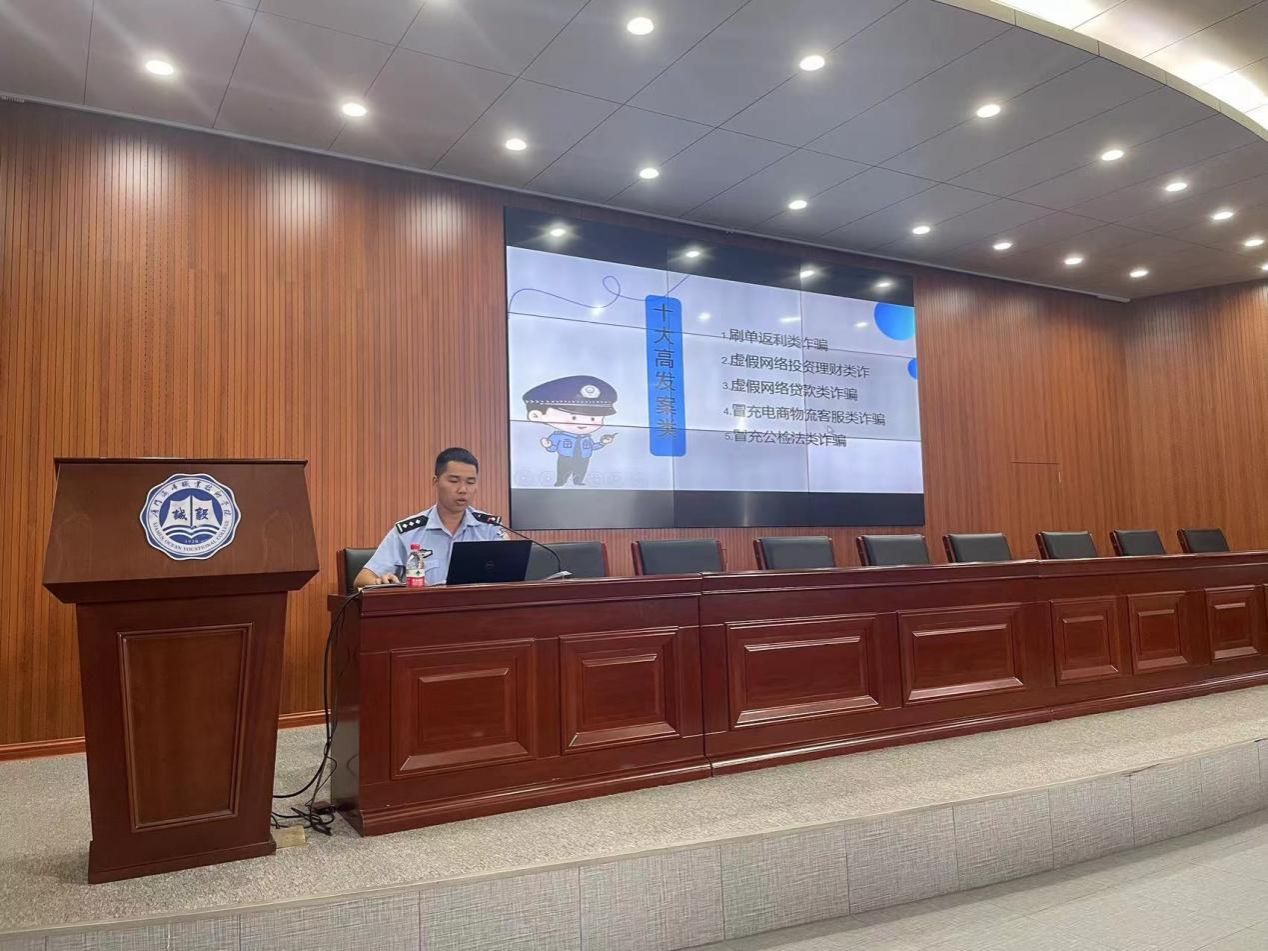 蒋振熠警官以刷单返利类诈骗,虚假购物、服务类诈骗,网络游戏产品虚假交易诈骗等十种贴近学生生活的高发诈骗类型为例,教会学生快速识别诈骗套路,增强学生防范诈骗意识,筑牢反诈安全屏障。