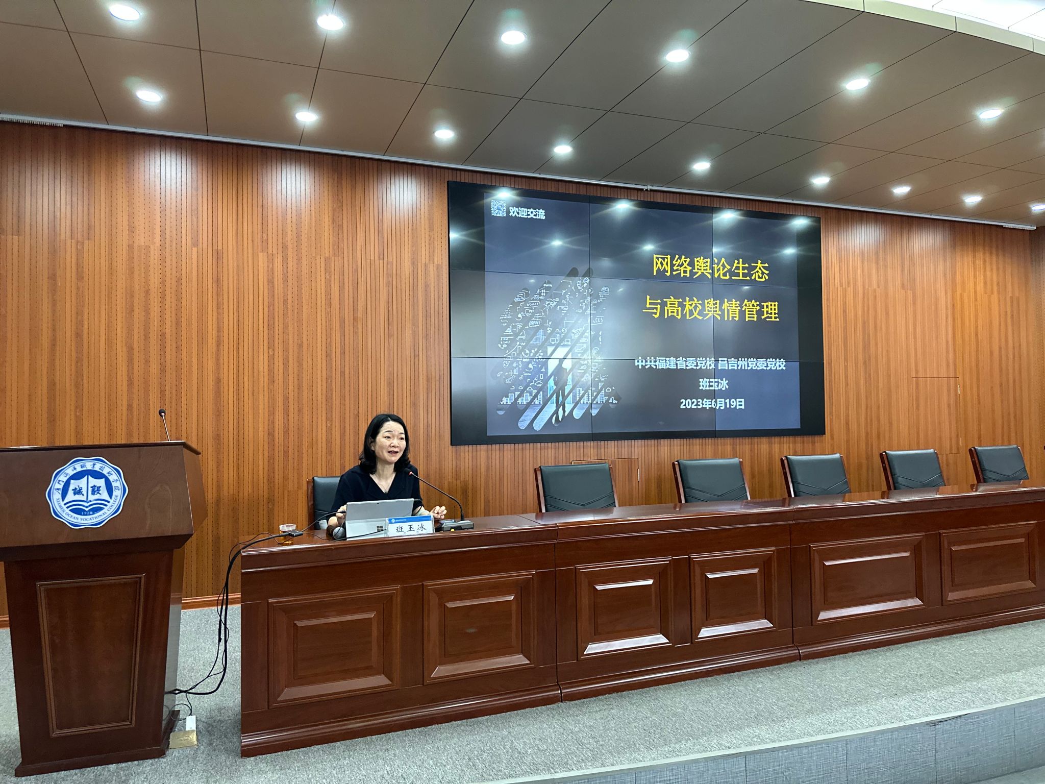 为深入开展学习贯彻习近平新时代中国特色社会主义思想主题教育,6月19日上午,我校举办2023年舆情管理工作专题培训。特邀中共福建省委党校公共管理教研部副主任、省应急管理培训基地副主任班玉冰副教授作“网络舆论生态与高校舆情管理”专题讲座。党委书记陈一端、副院长马国玄出席会议。