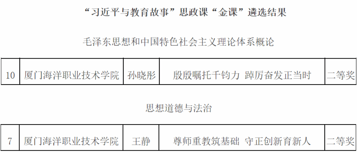 近日,由中共福建省委教育工委、福建省教育厅主办的福建省高校“习近平与教育故事”思政课“金课”遴选结果公布,马克思主义学院孙晓彤老师的《殷殷嘱托千钧力 踔厉奋发正当时》和王静老师的《尊师重教筑基础 守正创新育新人》分别获“毛泽东思想和中国特色社会主义理论体系概论”课程组、“思想道德与法治”课程组全省二等奖。