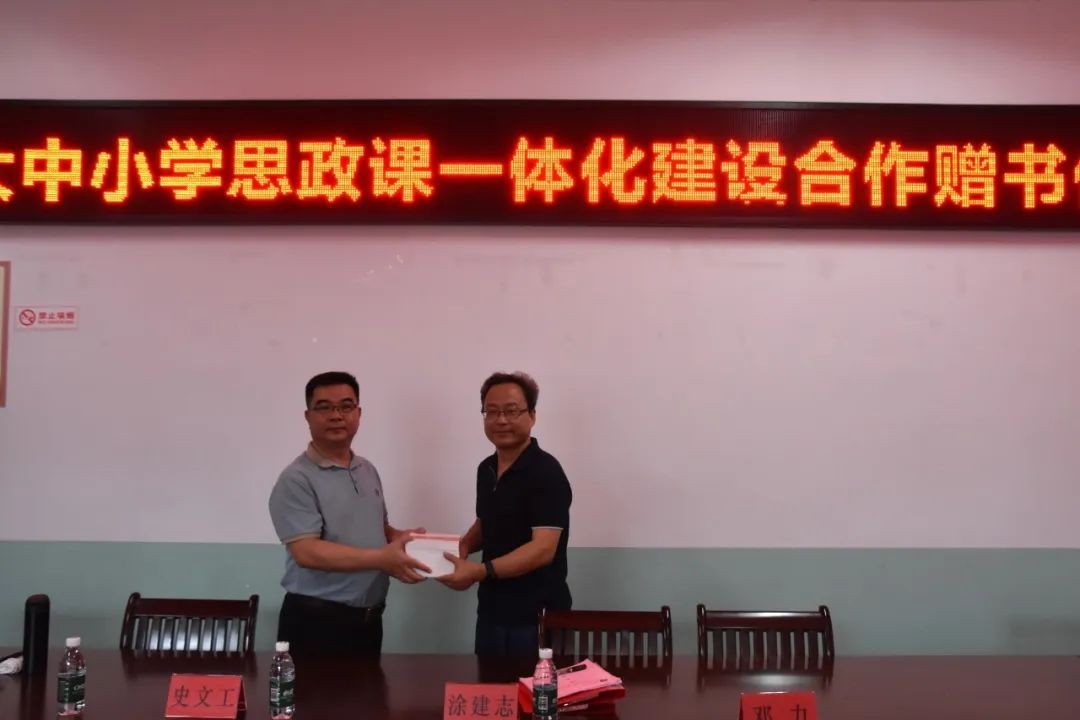 厦门海洋职业技术学院马克思主义学院和大田县教育局签署大中小学思政课一体化建设合作与共建协议。签字仪式上,大田县教育局党组书记涂建志书记就如何进一步推动大中小学思政课一体化建设发表了讲话,期望思政教师携手构筑育人“同心圆”,为全面提升各学段人才培养质量贡献力量。厦门海洋职业技术学院马克思主义学院向大田县鸿图中学赠送何金龙副教授主编的校本文化读本《陈嘉庚和陈嘉庚精神》。