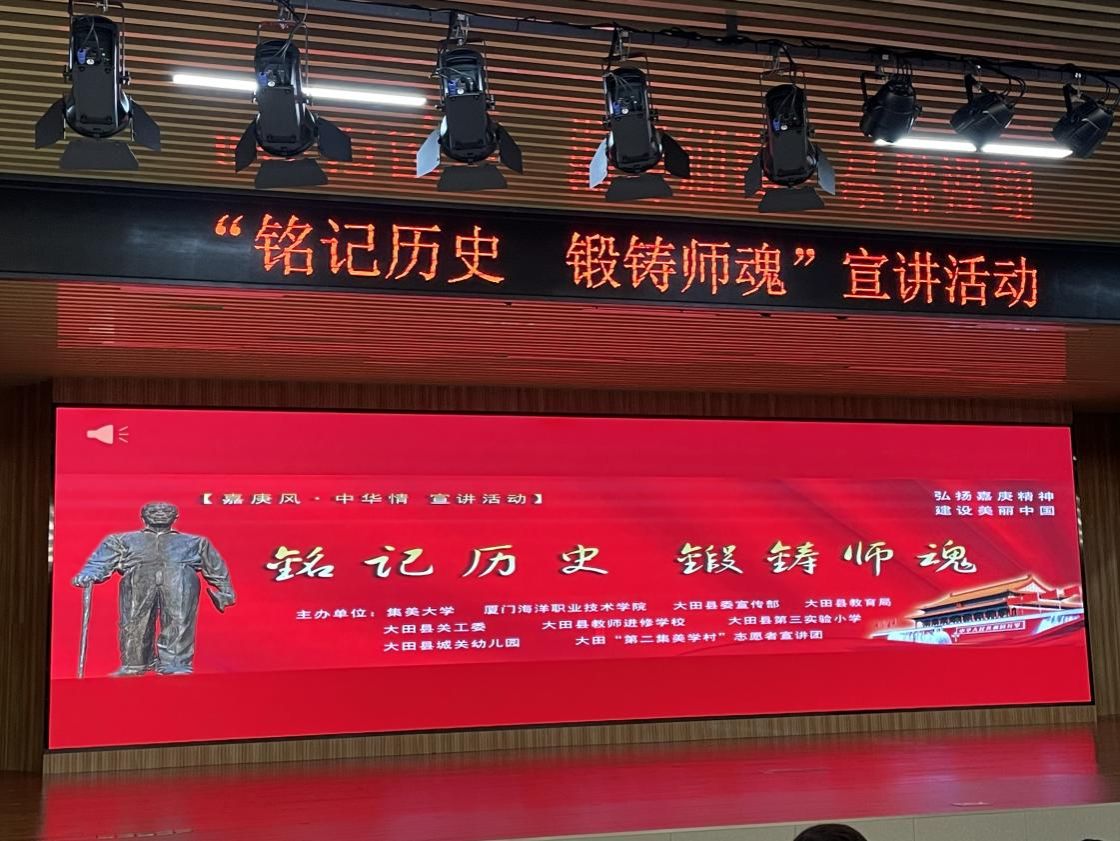 厦门海洋职业技术学院马克思主义学院与集美大学、大田县委宣传部、县教育局、县关工委、县教师进修学校、县第三实验小学、县城关幼儿园联办“铭记历史· 锻铸师魂”宣讲活动。重温陈嘉庚先生的演讲《有枝才有花,有国才有家》,体会陈嘉庚在抗日烽火时的信念与情怀。厦门海洋职业技术学院马克思主义学院青年教师赴国家级抗战遗址大田第二集美学村、大田一中“9·20”日寇轰炸大田纪事墙遗址和大田县济阳村开展现场教学。重走抗战播迁路,探寻当年集美学校师生在大田父老乡亲的帮助下,边学习边抗战,创造的抗战烽火中弦歌不辍的教育奇迹。