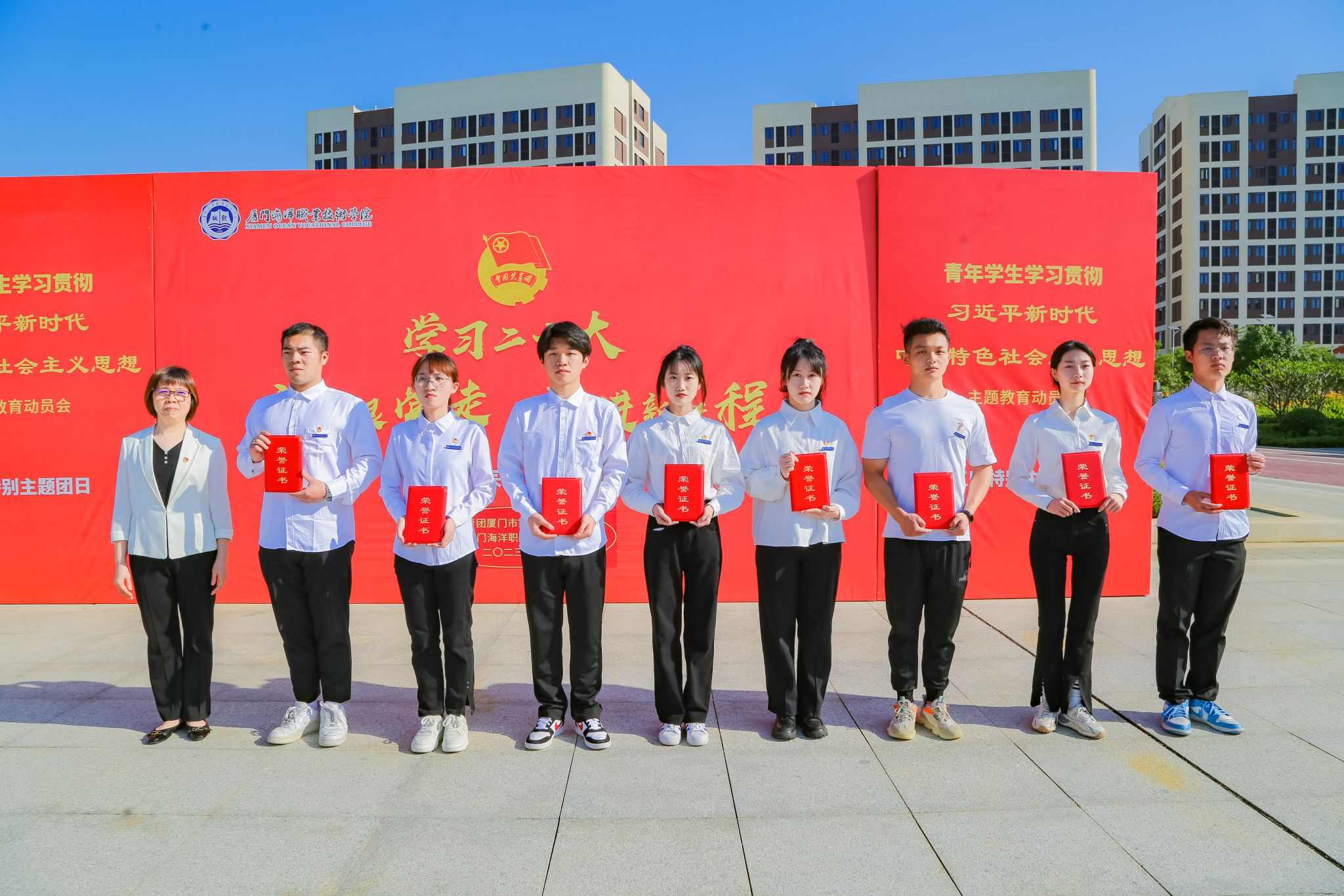 “我集齐了!”随着最后一枚印章盖在本次青年学生学习贯彻习近平新时代中国特色社会主义思想主题教育动员会暨五四特别主题团日邀请函上,刚刚成为新团员的国际商贸学院商英3221夏雨荷同学欢呼起来,她拿着集齐6枚印章的邀请函迫不及待地跑向团学活动大本营,排队领取校团委精心准备的“红色大礼包”:团学笔记本,新时代好青年钥匙扣,团学代言Q仔海小洋。跟夏雨荷同学一同竞争这份大礼包的还有另外999位新老团员,而真正闯关成功,能拿到这份红色惊喜的只有300个名额。这是发生在厦门海洋职业技术学院青年学生学习贯彻习近平新时代中国特色社会主义思想主题教育动员会暨五四特别主题团日上的生动一幕。