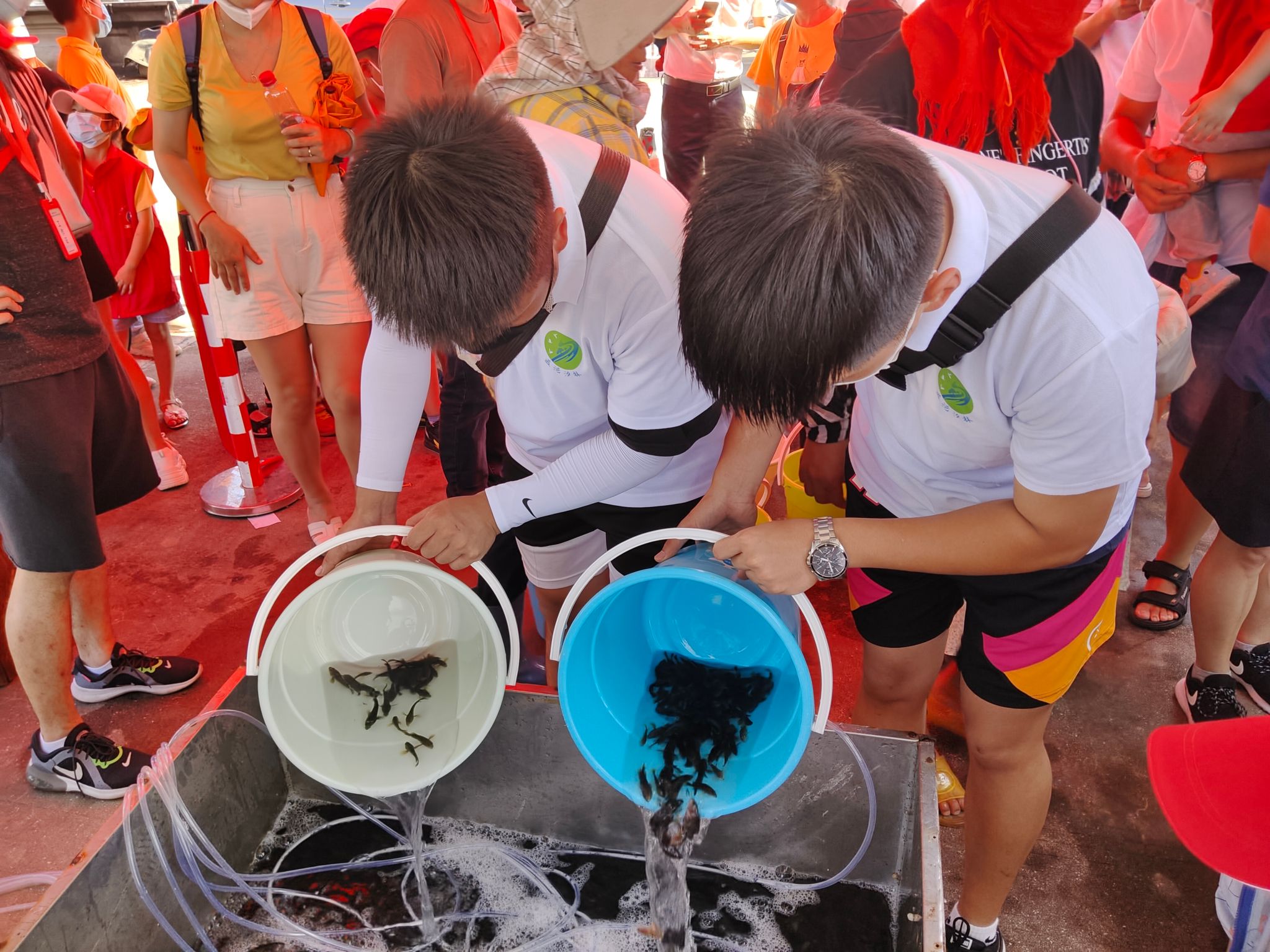 “蓝湾汐林”实践队抵达厦门海洋管理公务码头,在现场工作人员组织下,团队老师和同学们参与了“赤点石斑鱼”的增殖放流,现场为参与放流活动的市民科普了生物多样性和环境保护的知识。