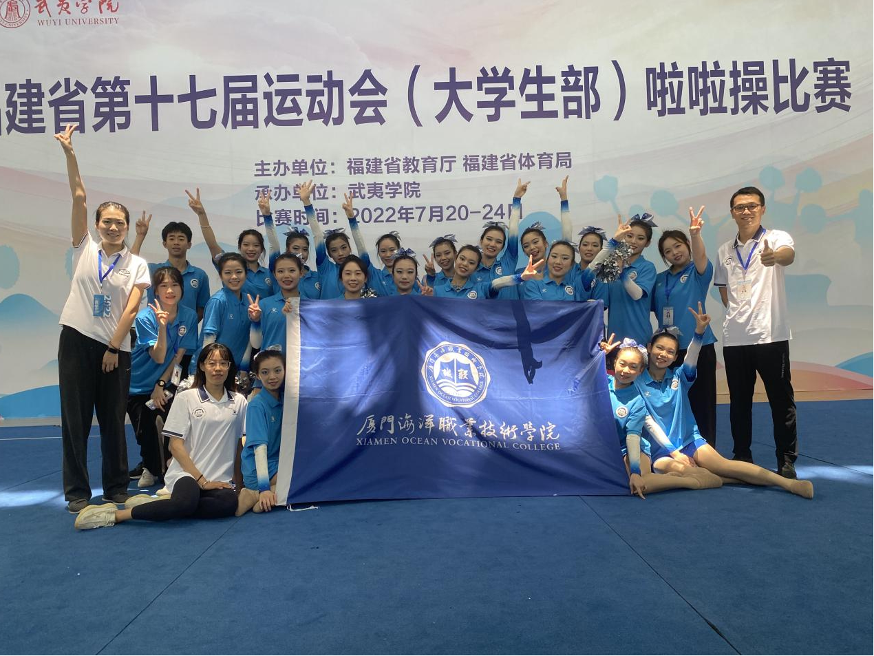 我院体育代表团团长由学校党委书记陈一端担任,领队教师、教练员20人,备赛运动员90人出征,参加高职高专组别的游泳、定向越野、田径、啦啦操、健身气功、武术、乒乓球、羽毛球共8个赛项的比赛。陈一端在出征仪式上鼓励参赛团队要团结协作,弘扬体育精神,传承道德风尚,赛出风采,赛出品格;要做到胜不骄败不馁,塑造体育灵魂,铸就强健体魄。最终我院体育代表团顺利完成比赛,并在多个项目上创造佳绩。