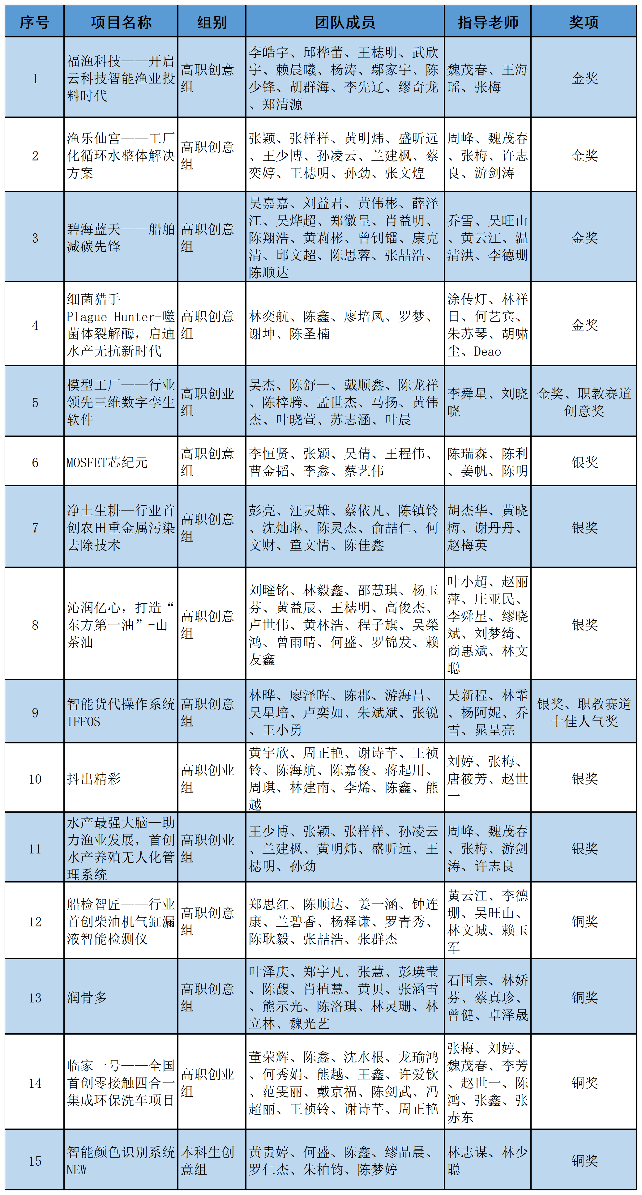 学校此次获奖项目将科技智能渔业、工厂化循环水、船舶减碳、智能货代等新技术与海洋经济各领域紧密结合,发挥互联网、科学技术在海洋产业、环保领域的作用,促进海洋产业转型升级,助力环保产业发展。