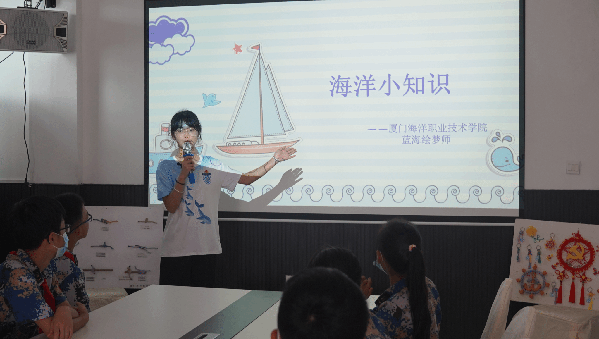 厦门海洋职业技术学院创办于1920年,校主陈嘉庚先生目睹旧中国“门户洞开,强邻环伺”之状况,秉持“开拓海洋、挽回海权、培育专才”之誓言创办学校,成为我国最早培养水产航海技术人才的摇篮之一。围江学校创办于1920年,学校在炮火中分拆到各地,但从未停下办学的脚步。此次“蓝海绘梦师”实践队来到围江学校,开展“蓝色海洋知识”讲座,围绕海洋权益维护、海洋资源、海洋文化等领域,讲述灯塔文化历史、海洋地理、海军舰艇知识。实践队现场普及航行中专业绳结的作用,开展“大手牵小手”海丝结工艺品编织比赛,从认识海洋、保护海洋、海洋强国等方面入手,点燃了孩子的海洋梦,为我国海洋强国建设培养了一批小小接班人。