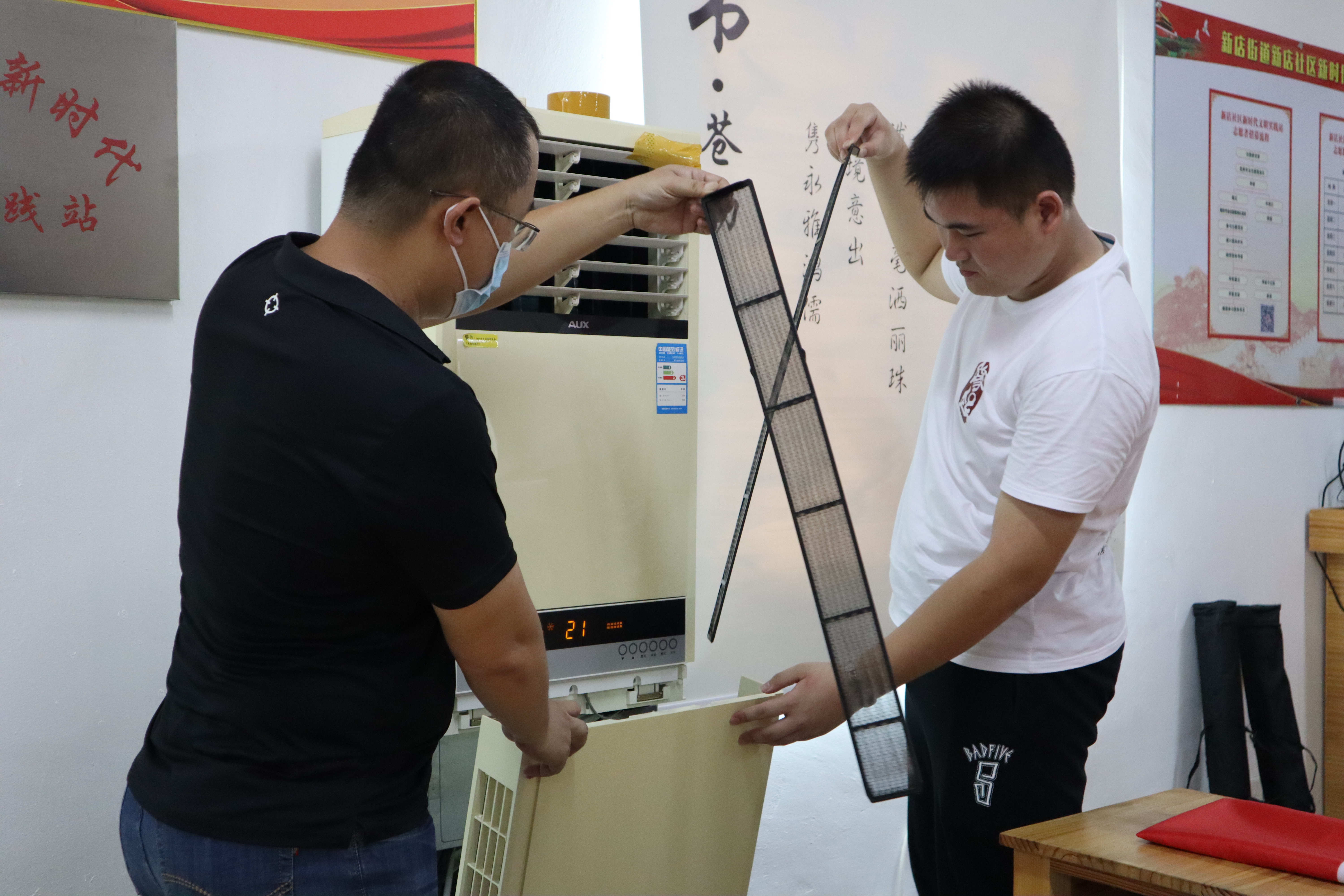 队员们熟练地打开空调室内机盖、取出过滤网,用沾有清洗液的刷子清洁过滤网,动作一气呵成。队员们以不怕脏、不怕累的精神,让原本布满灰尘的过滤网焕然一新。
