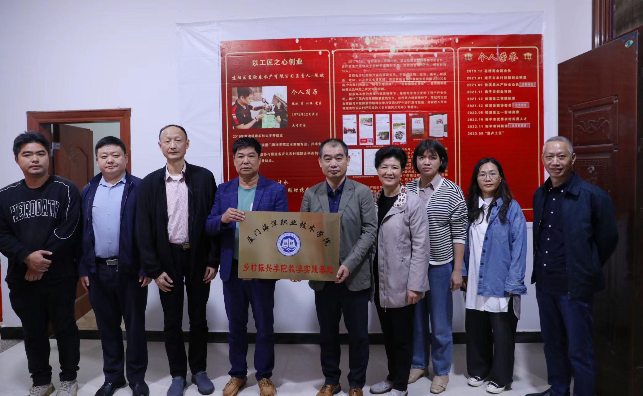 服务队第三站到达龙岩市连城县朋兴村,在全国渔业科技示范基地——德洋水产有限公司调研“红螯螯虾+溪石斑+水稻”共生模式实践情况。缪雄平向公司负责人、19级淡水班黄德洋夫妇授予“乡村振兴学院教学实践基地”牌匾。黄德洋表示,很高兴能协助母校开展高素质农民实践教学,向学弟学妹们传授红螯螯虾养殖技术。