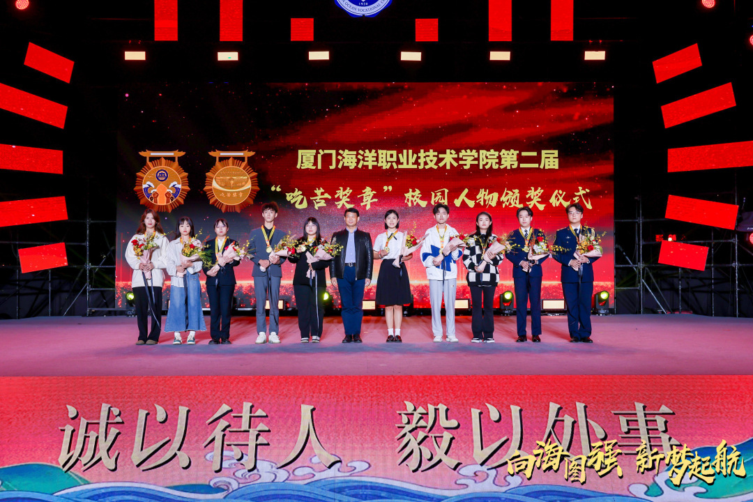 践行习近平总书记提出的培养“能吃苦”的新时代青年,铸造“吃苦奖章”育人品牌。 晚会期间,党委书记陈一端为我校10名“吃苦榜样”先进个人颁发“吃苦奖章”。他们是从“志愿服务”“社会实践”“专业学习”“文化艺术”“生活劳动”五个方面,在学生组织和学生群体中挖掘培育树立的“吃苦”典型,为海院学子树立“青春榜样”。